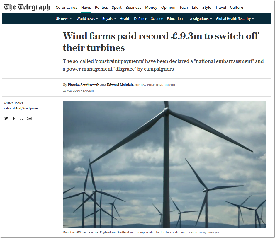 STT is at a loss to find many other current examples that match the profligacy of paying what are called “constraint payments” to wind power outfits, so that they won’t deliver power to the grid when the wind is blowing.