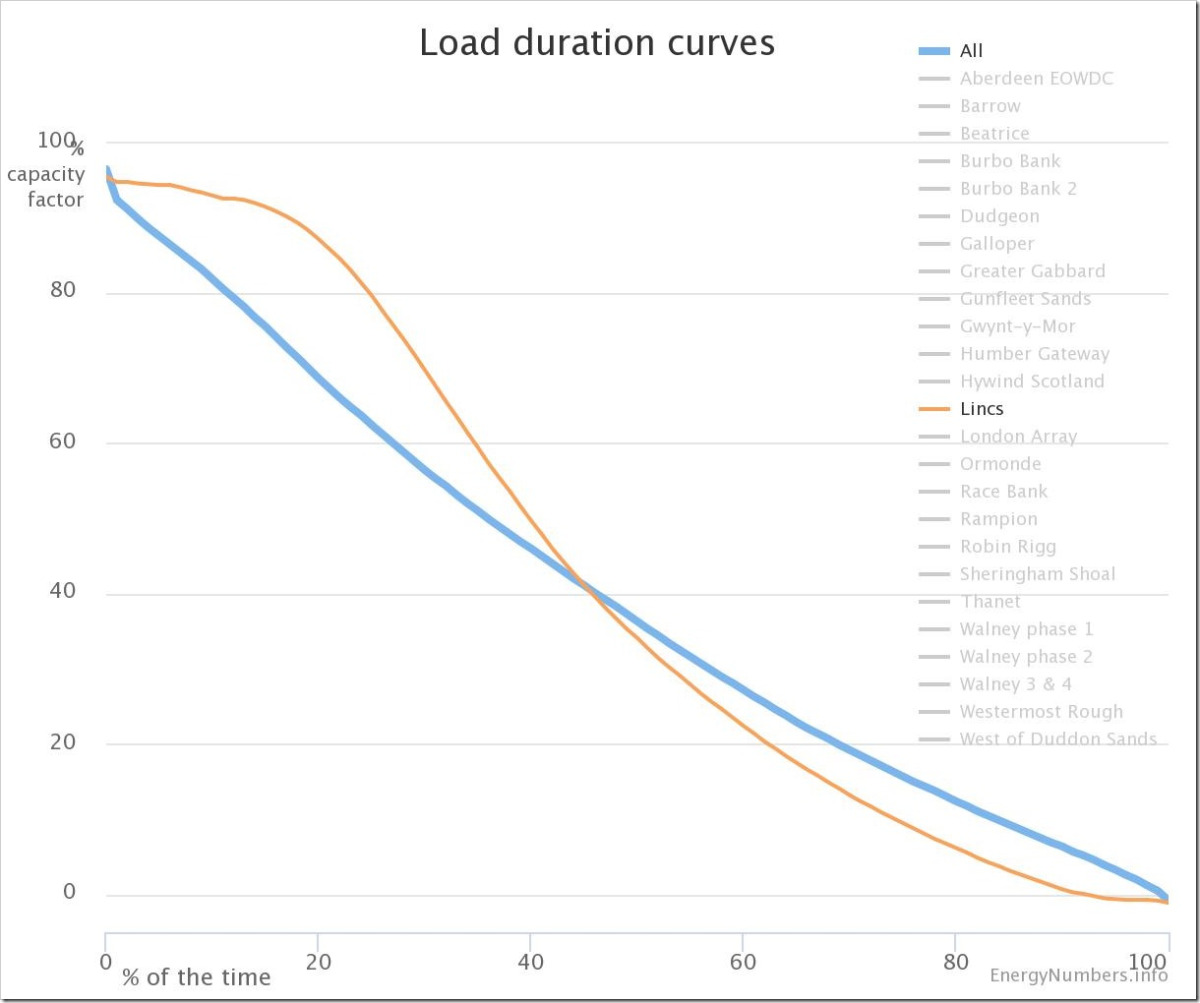 As regards that Load Duration curve on the chart above: if you look at Figure 6 in my paper from 2012, (oh, you mean, that old thing?), you will find pretty much exactly the same characteristic for wind farms here in Eastern Australia. The curve means that wind generation can be relied upon for practically no time at all.