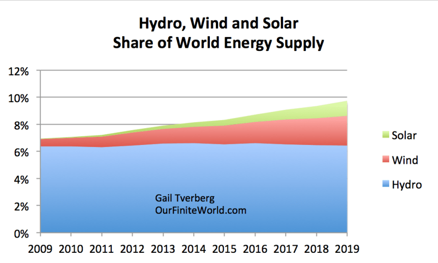 Figure 6. Hydroelectric, wind, and solar electricity as a percentage of world energy supply, based on BP’s 2020 Statistical Review of World Energy.