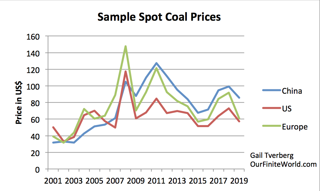 Strangely enough, coal prices (Figure 3) seem to follow a very similar pattern to oil prices, even though coal is commonly believed to be available in huge supply, and oil is commonly believed to be in short supply.