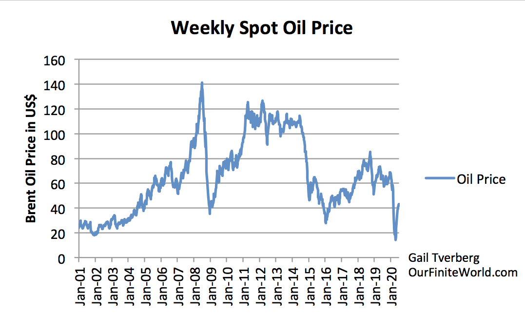 If we examine oil prices (Figure 2), it is apparent that, at least recently, this is not the way oil prices actually behave. Since the spike in oil prices in 2008, the big problem has been prices that fall too low for oil producers. At prices well below $100 per barrel, development of many new oil fields is not economic. Low oil prices are especially a problem in 2020 because travel restrictions associated with the coronavirus pandemic reduce oil demand (and prices) even below where they were previously.
