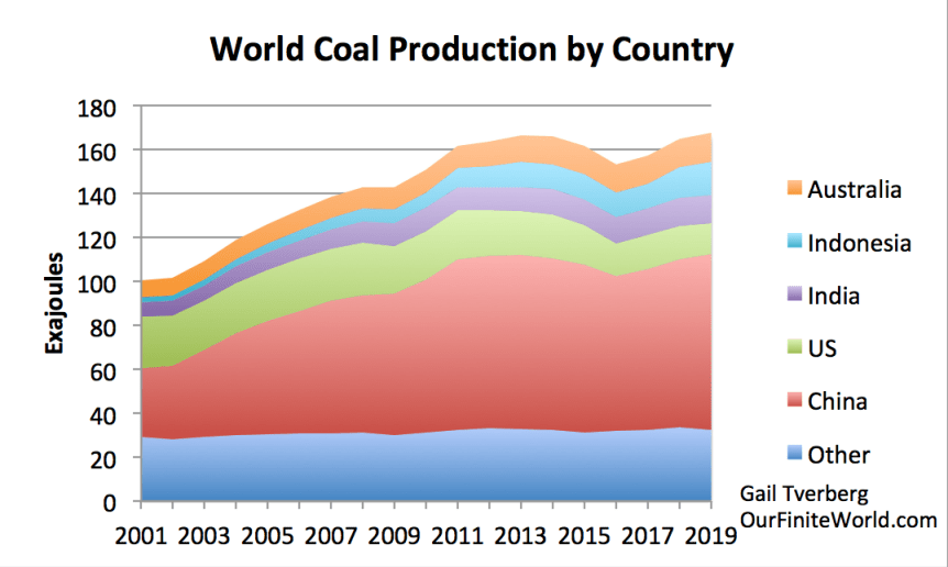 Because of continued low coal prices, world coal production has been on a bumpy plateau since 2011. Prices seem to be even lower in 2020 than in 2019, putting further downward pressure on coal extraction in 2020.