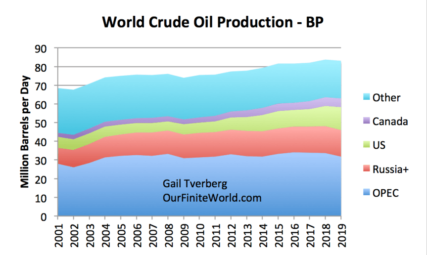 In total, BP data shows that world crude oil production fell by 582,000 barrels per day, comparing 2019 to 2018. This represents a drop of 2.0 million barrels per day in OPEC production, offset by smaller increases in production for the US, Canada, and Russia. Crude oil production is expected to fall further in 2020, because of low demand and prices.