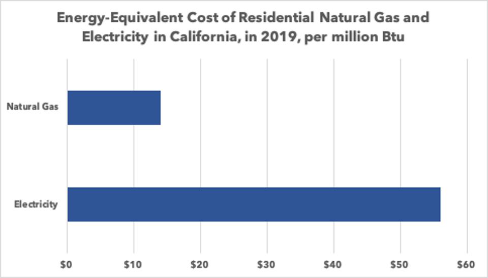 Proponents of all-electric buildings claim that natural gas can be replaced by electricity. But when measured on an energy-equivalent basis, residential electricity in California costs four times as much as natural gas