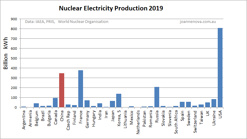 President Xi will be delighted that so many industrial competitors are sabotaging their electrical grids with erratic, unreliable solar and wind power. Right now, The People’s Republic of China is the biggest platform in the world for the deployment of nuclear power technology. In twenty years, China has increased its fleet of nuclear power reactors from three to 48, with 11 more plants under construction. That means it will soon surpass France which has 57: