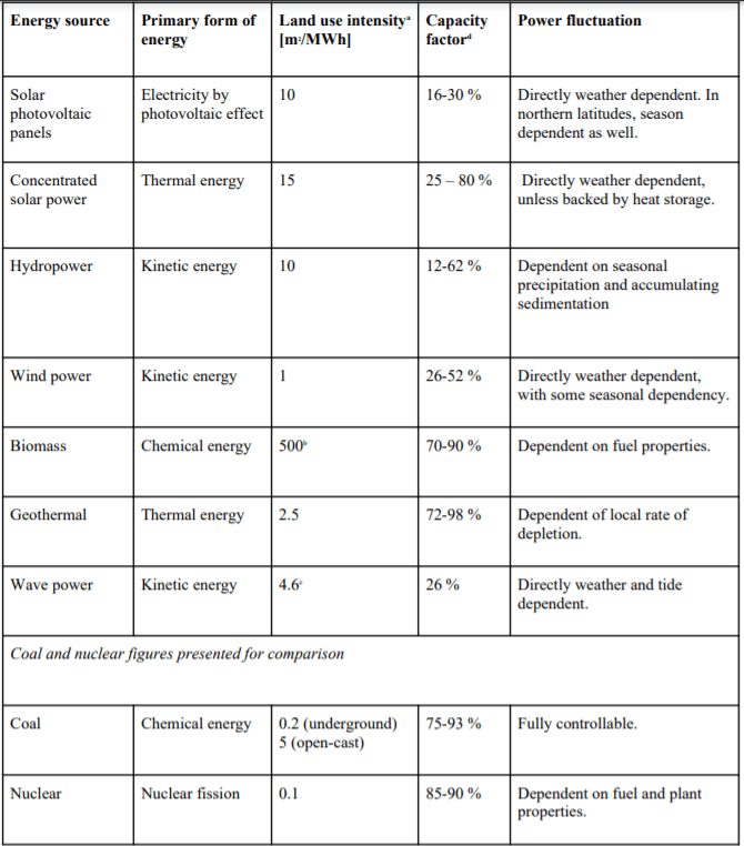 Table 1 illustrates the miscellaneous nature of renewable energy sources. The different renewables are compared based on their power density, primary form of energy harvested, land use, capacity and nature of fluctuation. Power density is here measured by estimated land use intensity. This number depends greatly on the underlying assumptions of what is included, but the diverse nature of the renewables itself makes direct comparison complicated.