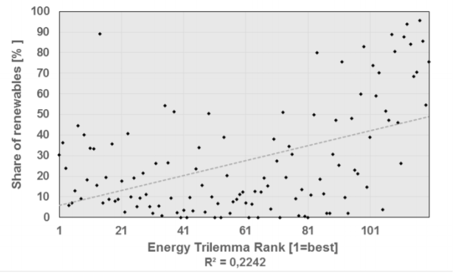 Figure 3: The Energy Trilemma rankings and share of renewables in total primary energy supply in 2017 for 120 countries (Data: World Energy Council 2017)