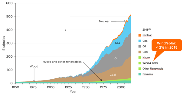 Extrapolating the trends shown in Figure 1 to the future, it becomes questionable that non-hydro renewable sources such as wind and solar will provide the energy required in a sustainable and environmentally friendly way.
