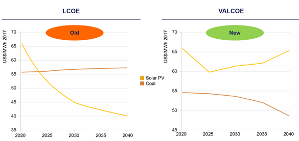 Figure 5: Levelized cost of electricity (LCOE) and value-adjusted LCOE (VALCOE) for solar PV and coal-fired power plants in India[6]