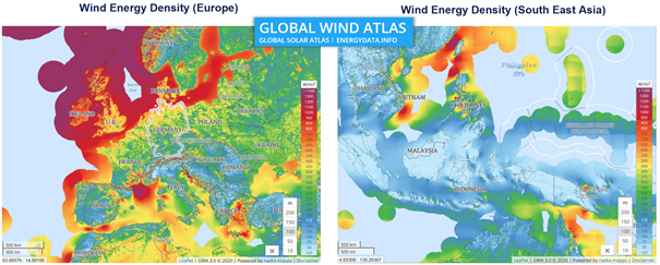 Figure 2: Wind has very low energy density with density in Asia even lower than Europe[3]