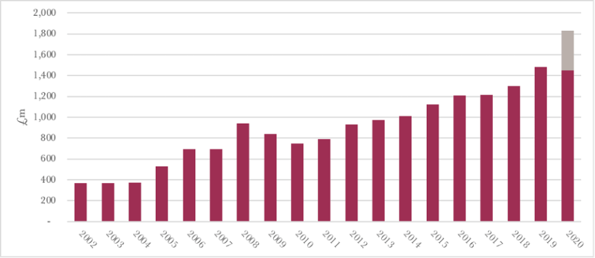 Figure 3. Balancing Services Use of System (BSUoS) Costs 2002 to 2020. Red indicates actual recorded costs, grey the author’s estimate for the remainder of 2020. Source: Data from BM Reports, chart by the author.