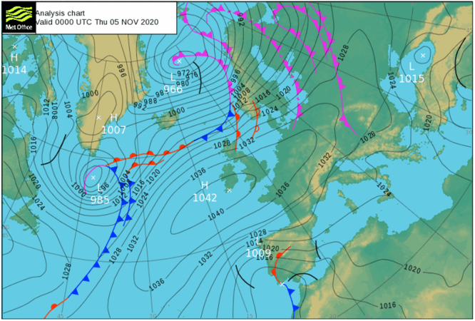 Figure 1: Met Office Ground Pressure Chart. 5 November 2020. Source: Met Office.[1]