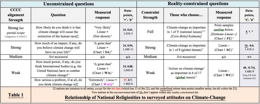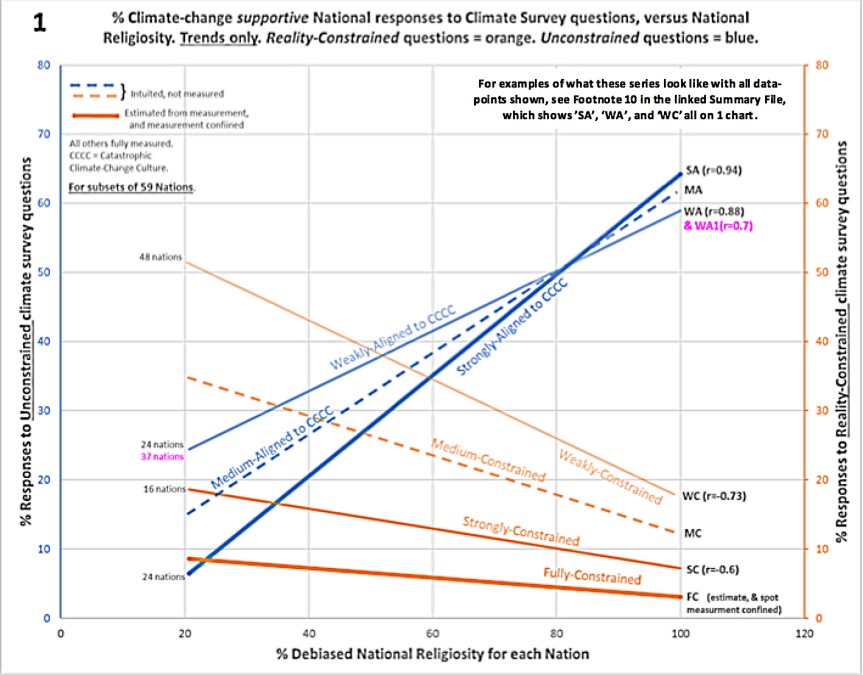 Prior posts here, show that supportive attitudes to climate-change (CC) across national publics, have a dual and systemic strong relationship with religiosity. CC supportive public responses to unconstrained climate survey questions correlate with national religiosity, while oppositely, CC supportive responses to reality-constrained questions anti-correlate with national religiosity. [Reality-constrained questions force survey participants to consider and compare other reality issues in relation to climate change, typically by asking them to nominate the X ‘most important’ from a larger list of Y issues, of which one represents a climate-change issue, or literally just ‘climate-change’. Unconstrained questions don’t force such a comparative choice]. Using some data-series from the prior posts, Chart 1 below summarizes this dual relationship. For many nations and plotted against national religiosity, it shows the CC supportive public responses measured (and for the dashed lines, intuited) for different strengths of both unconstrained and reality-constrained survey questions.