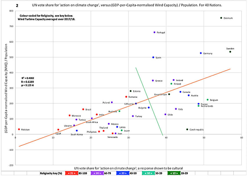 The plot: Across the 40 nations, UN vote share for ‘action on climate change’ (from ‘WC’ data), versus GDP-per-Capita-normalised Wind Turbine Capacity / Population (to 2018), shows a +ve correlation. This suggests that Wind Turbines are significantly motivated by a ‘WC’ type cultural climate-change attitude: