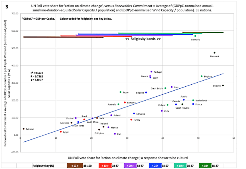 The greater range of spread of nations at the RHS has considerably reduced (excepting for Germany), this being consistent with expected total renewables motivation, which nevertheless may express much more in Wind Turbines than Solar for any particular single nation, or vice versa. The lens we used to see in the first place that attitudes to climate-change are cultural, i.e. the religiosity of nations, is color-coded onto Chart 3. This falls from left to right, albeit fuzzily because aside from some random noise, there’s a minor secondary variable at play which impacts religiosity as seen in this view (see Postscript 2).