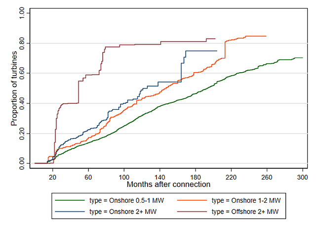 The first part of the study examines equipment failures and major breakdowns. Figure 6 shows the failure curves by turbine category focusing on the time to the first equipment failure. The results are similar if alternative failure indicators are used. The conclusions are that (i) offshore turbines are less reliable than onshore turbines, and (ii) the older small (< 1 MW) onshore turbines were much more reliable than the 2+ MW turbines that dominate wind farms constructed since 2005. Nearly 60% of offshore turbines will experience an equipment failure in their first 5 years of operation. The reliability of 2+ MW onshore turbines deteriorates over time, so that the risk of failure increases sharply once they have been operating for more than 10 years. Finally, there are strong locational differences within Denmark with the expected number of months affected by equipment failure over a 20-year operating life increasing from 8 months in the west of the country to 15 months in the east. The reason seems to be a combination of site choice and wind turbulence caused by wind flows over land for the prevailing westerly winds.