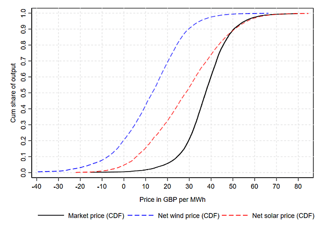 In a forthcoming study I have estimated the marginal cost of balancing supply and demand in the UK which covers some but not all of these system costs. The marginal balancing cost is closely related to the level of wind output, varying from £11 per MWh at the 5th percentile to £31 per MWh at the 95th percentile. Figure 9 shows the effect of allowing for this element of system costs on the cumulative distribution of the net values of wind and solar output in 2019-20. Net value in this context means the market value of the power minus the extra system costs incurred in handling wind or solar output. The solid black line is the cumulative distribution of market prices, while the dashed blue line shows the cumulative distribution of the net values of wind output. There is a large difference between the two: 50% of all wind output in the year had a net value of less than £13 per MWh and 20% of all output had a negative net value, i.e. it made everyone worse off. To be clear, Figure 9 shows that the breakeven cost of producing wind output with a net value of less than £13 per MWh is between £91 and £152 per MWh.