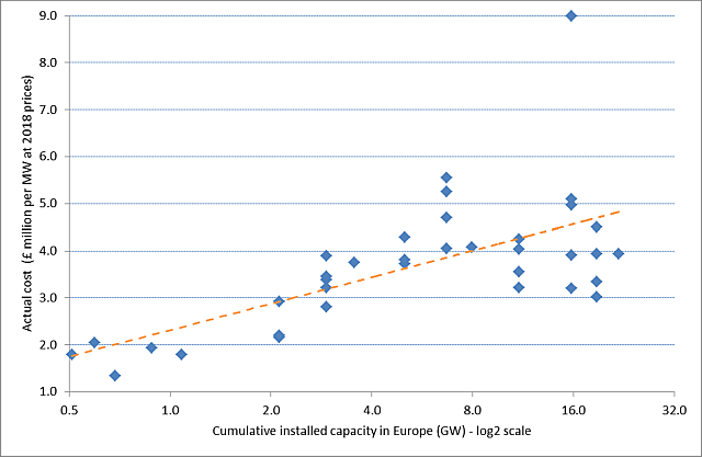 Figure 2 : UK offshore wind : actual capex cost versus installed capacity in Europe