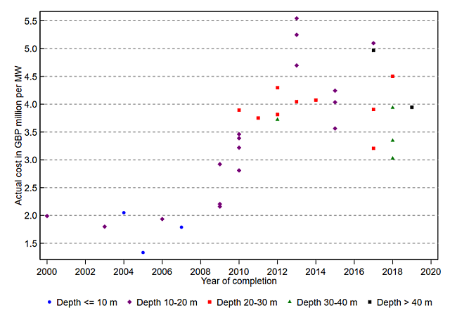 Figure 3 : UK offshore wind : actual capex cost by depth and year