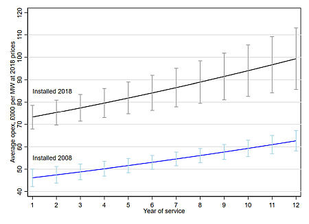 Figure 4 UK onshore wind: average opex costs vs year of service