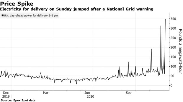 Power for delivery on Sunday evening traded as high as 350 pounds ($470) a megawatt-hour in an auction on Saturday on Epex Spot SE. That’s the highest for the 5-6 pm period since November 2016. The peakload contract jumped to 96.29 pounds a megawatt-hour, the highest since 2018, the data show.