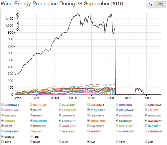 It is now a given that the forced shut down of 315MW of wind power output caused the complete collapse of SA’s grid, and it is unarguable that wind turbines were shut down as wind speeds increased on Wednesday, 28 September.