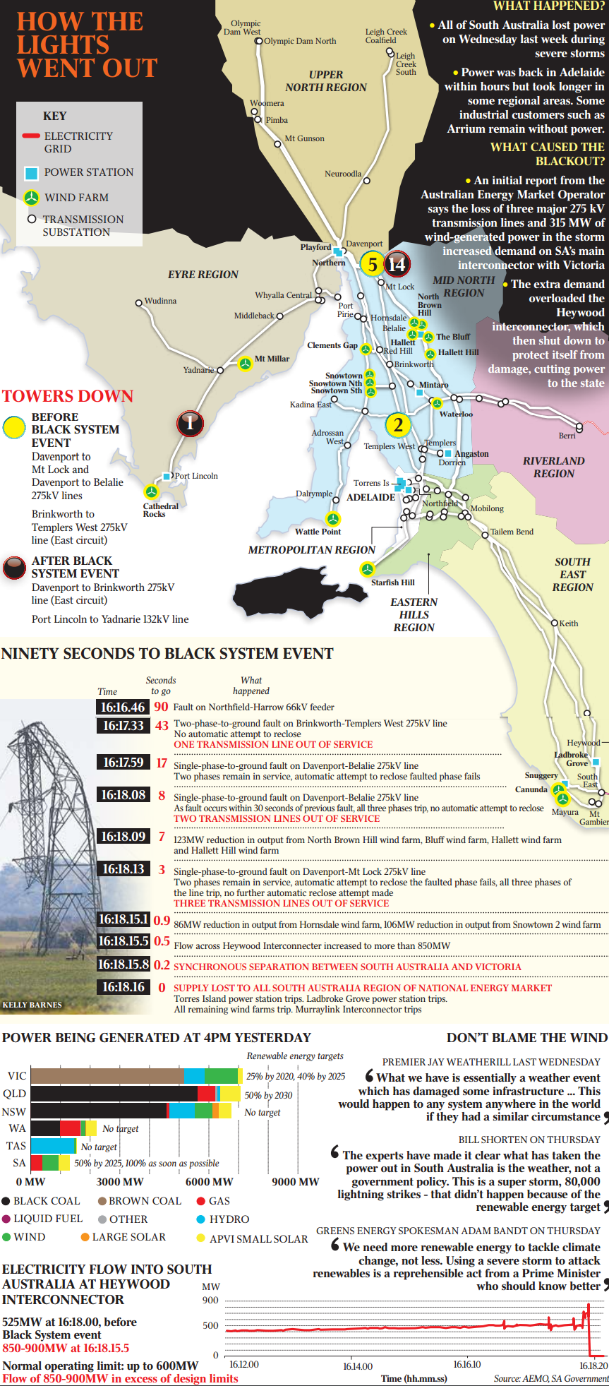 Both the ABC and The Standard run the hackneyed line about pylons collapsing on a single transmission line during a storm causing all the trouble. Had they bothered to look a little closer, they might have identified the fact that the pylons and transmission line did not fail until late in the day (see above) and that the issues relating to transmission lines occurred after 4.16pm that day.