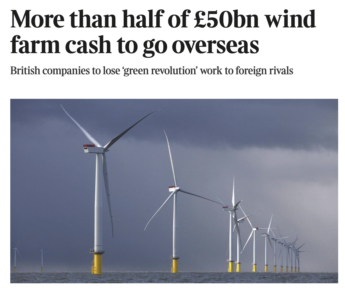 According to a report in today’s Times, more than half of the estimated £50bn investment for Boris’s planned offshore wind farm expansion is expected to go to companies overseas. SSE, the report says, opted for manufacturers in Asia, citing lower costs.