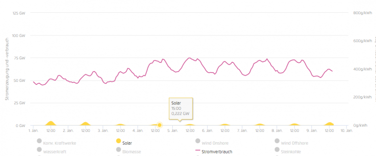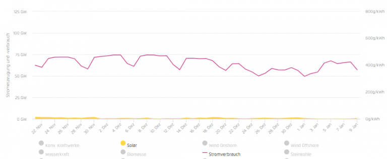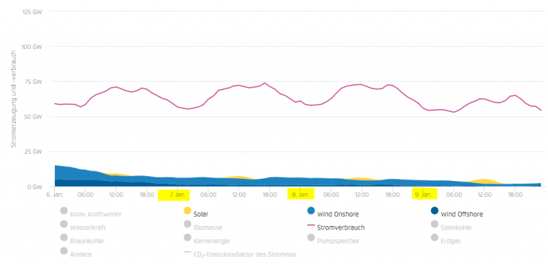 The dark blue curve depicts Germany’s total electric power consumption, which ramped up again Sunday evening, January 3rd, as factories started up again. The yellow shaded nubs depict the solar energy produced over the period, same as nothing.