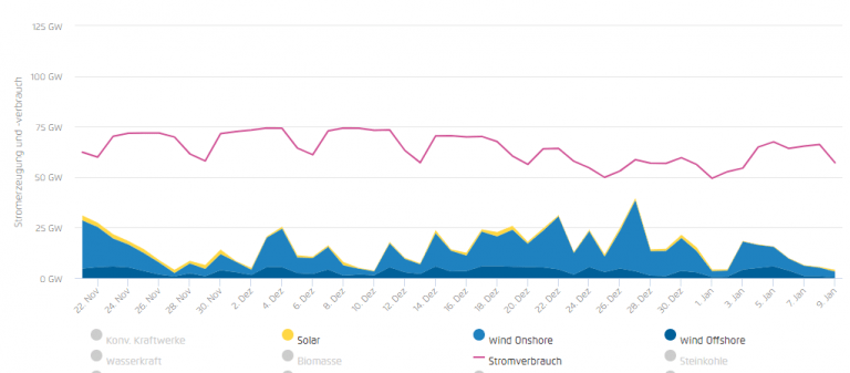The denial of electrical power may even be necessary soon in the future, anyway – like it was in communist Romania in the wonderful Ceausescu days. Just look at how Germany’s 50 GW – yes, gigawatts – of solar power have performed since January 1st.