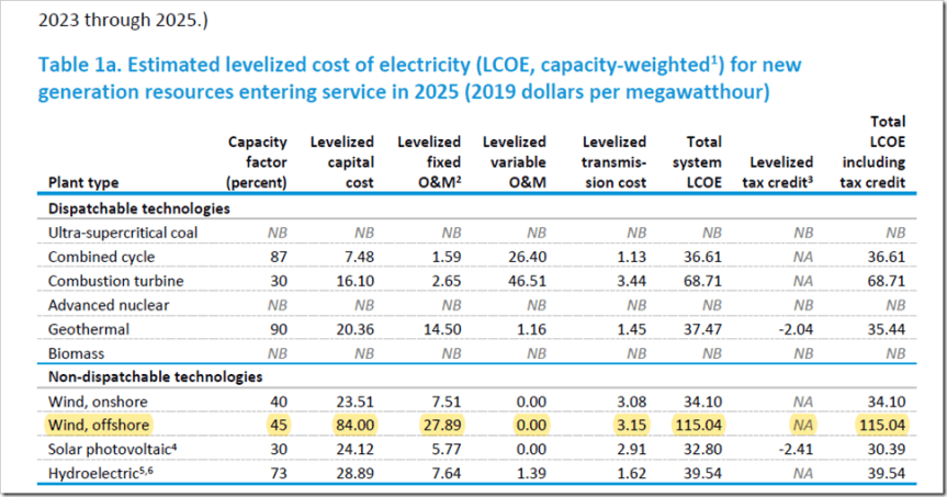 The US Energy Information Administration however don’t agree. They regularly assess the levelised costs of all power sources, and only a year ago calculated that the cost of offshore wind was $115.04/MWh, roughly £84/MWh, at current prices.