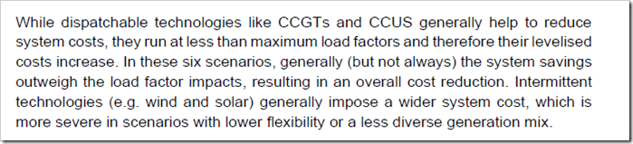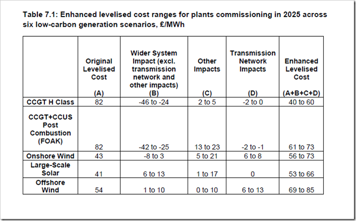 As Table 7.1 shows, these hidden costs could range between £15 and £35/MWh for offshore wind. By contrast, CCGT actually results in lower wider system costs (note the levelised cost of £82/MWh for CCGT includes a fake carbon cost of £32/MWh).