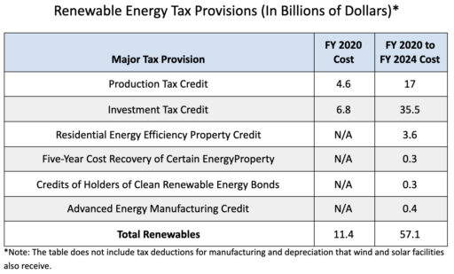According to the Joint Committee on Taxation, the production tax credit for wind is estimated to cost taxpayers $4.3 billion in fiscal year 2020, the investment tax credit for solar is estimated to cost $6.0 billion. Because other renewable fuels also receive those credits, the table below shows higher numbers for them. Credits are much more valuable to companies because they represent a dollar-for-dollar reduction in any taxes owed as compared to deductions, which are based on the percentage of income tax owed. Since the corporate income tax is currently 21 percent, tax credits are worth about 5 times as much as deductions to a claimant.