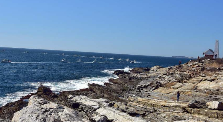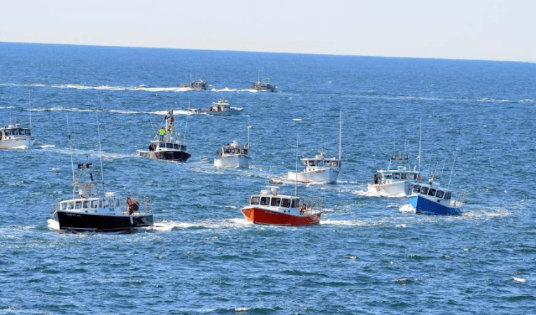 Dozens of lobster boats gather off Monhegan to protest floating wind turbine