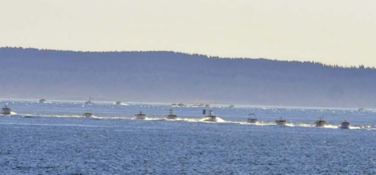 On Sunday, several dozen fishing boats formed a protest flotilla off Monhegan, when the survey vessel was not active nearby.