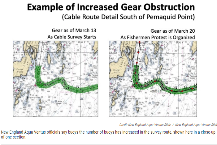 Aqua Ventus spokesman David Wilby says the Go Liberty documented some 220 buoys in the zone in mid-March, and found twice that number there a week later.