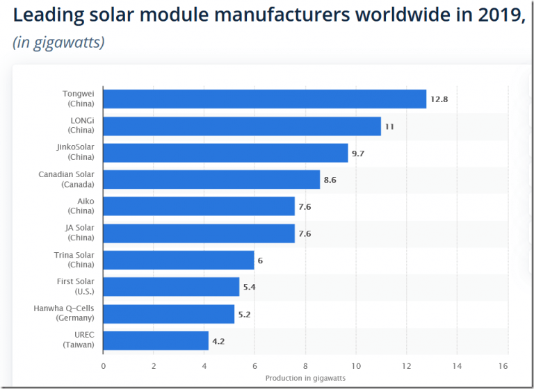 Paul Homewood points out that the top ten solar panel makers are corporations in China, China, China, Canada, China, China, China, US, Germany and Taiwan. Even Canadian manufacturing relies on plants in Asia or Latin America and Panasonic has abandoned it’s solar factories in Malaysia and Japan. Who can compete with forced labour?