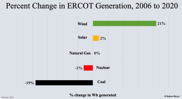 Between 2006 and 2020, the amount of electricity generated from coal dropped by 19%, while the amount of juice Texans got from wind surged by 21%. Over that same period, the amount of electricity produced from solar increased 2%, nuclear generation dropped by about 3%, and natural gas-fired generation stayed flat. (In 2020, gas-fired generation provided about 46% of the state’s electricity, the same share it had in 2006.)