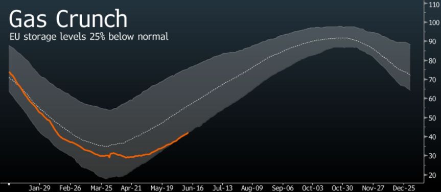 All of that means that European storage is currently 25% below the five-year average and benchmark Dutch gas surged more than 50% this year.