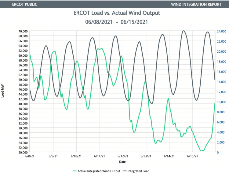 On the graphic below, which I retrieved from ERCOT’s website on Wednesday, the black line shows electricity demand. The green line is wind output. On Monday, when demand was hitting 70,000 megawatts, wind output dropped to about 3,000 megawatts. On Tuesday, as power demand was again approaching 70,000 megawatts, wind energy production dropped to nearly zero.