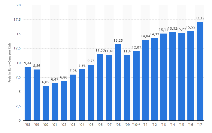 Electricity prices for German industry on average have climbed nearly 200% since green energies were mandated. Source: BDEW