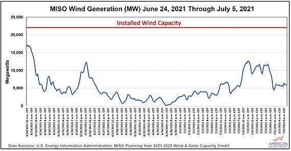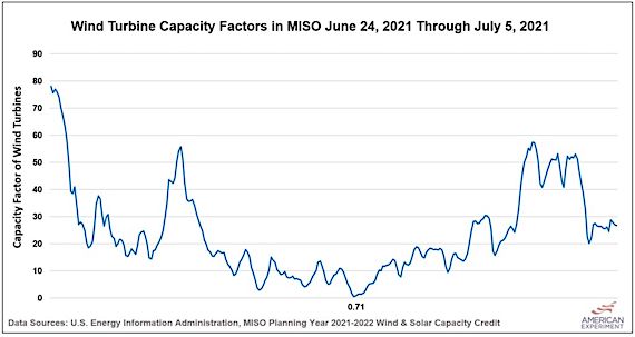 At midnight on June 24, 2021, wind turbines were operating at about 80 percent of their capacity factor, but by 11 am on June 30, 2021, all of the wind turbines in the 15 state regional grid were generating just 0.71 percent of their potential output.