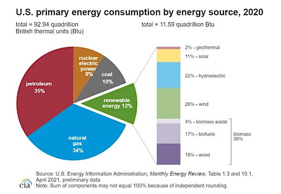 All “renewable” sources together account for only 12% of our energy consumption, but the details make the story even worse: