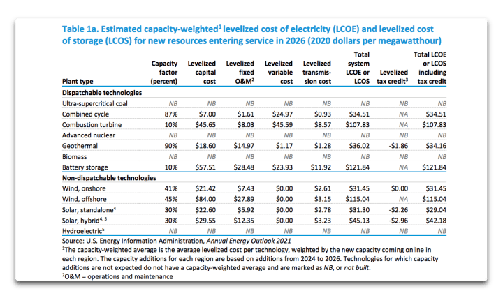 Here is the latest information on the LCOE for various energy sources, from the U.S. Energy Information Administration (EIA) 2021 report entitled Levelized Costs of New Generation Resources.