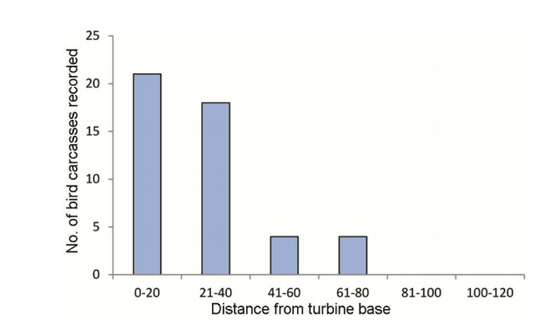 Distance from the turbine base at which carcasses were recorded in Samakhiali wind farm, Kutch, Gujarat.