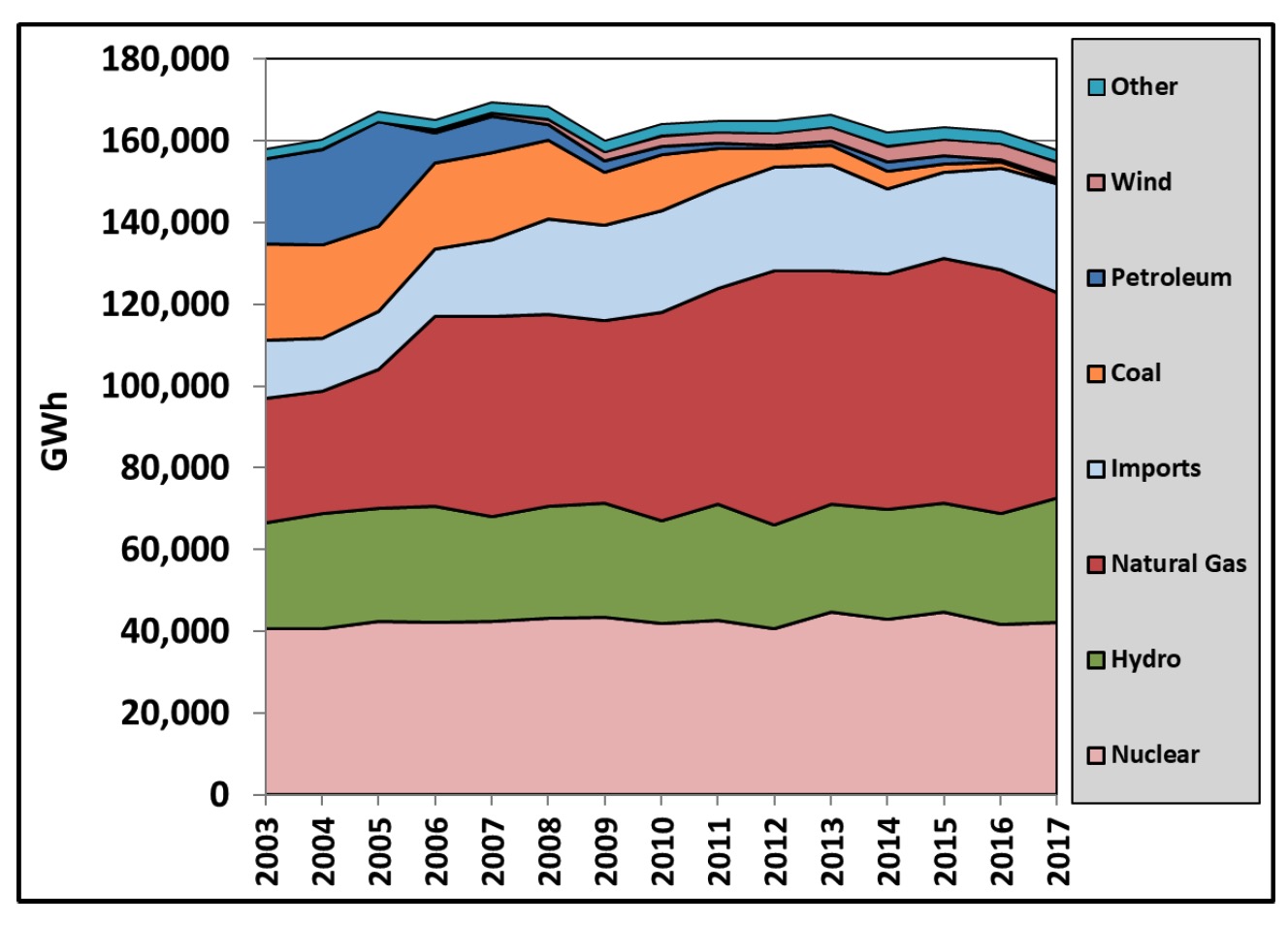 New York State Electric Generation by Fuel Type 2003–2017 (Source: Patterns and Trends)