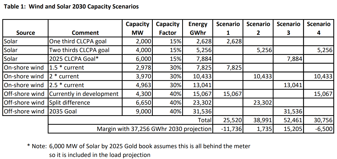 Table 1 lists the capacity (MW), capacity factors, and projected energy (GWhr) from all the scenarios and four total scenario projections. Scenario 1 uses the low end estimates for all sources and has a deficit of 11,736 GWhr. Scenario 2 uses the mid-point estimates for all sources and has a 1,735 GWhr surplus. If al the estimates are at the high end in Scenario 3 there is a surplus of 15,205 GWhr. My personal best guess (Scenario 4) is mid point for utility solar and on-shore wind but the low estimate for off-shore wind because the entire infrastructure to develop off-shore wind has to be built first. That scenario has a deficit of 6,500 GWhr.