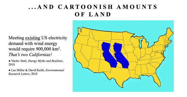 The title of the program was “The Environmental Catastrophe of Wind and Solar Power,” although the program’s content was somewhat broader than that. What follows are a few of the slides from yesterday’s presentation that illustrate the foolishness of trying to power our electric grid–let alone our whole economy!–with wind and solar energy.