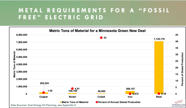 Minnesota is almost exactly average in population, so you can estimate the national numbers by multiplying by 50. And this is just the U.S., not the world, and just to meet existing electricity demand, not to “electrify everything” with electric vehicles and much else, as many on the Left demand. The red dots show the percentage of existing global production of each of those materials represented by Minnesota demand alone.