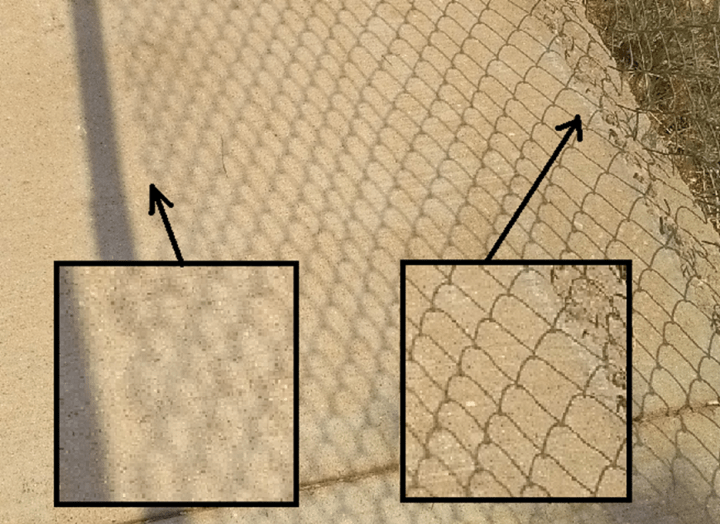 What actually occurs when an opaque object obstructs light is that the edges of the object serve as secondary, or even tertiary, point sources of scattering. Interference of this scattered energy in the illuminated field beyond the obstruction produces what we observe — shadows are a diffraction pattern.[2] In the near field diffraction produces a shadow with sharp edges the geometry of the obstruction, but very quickly with increasing distance the edges of shadows blur into a more complex pattern of illumination. The image below shows this. The chain link casts a distinct, sharp edged shadow on the sidewalk on the right side of the photo. Here the wires subtend a large angle from the surface of the walk. On the left side the wires subtend a small angle that is less than 20% the angle subtended by the sun. Even though the shadows are not sharp edged, they are certainly not gone. In fact, the shadows of the top chord or beam of the fence have diffused edges even though in this instance at twice the subtended angle of the sun, a person might think this pipe should cast a geometrical shadow. Shadows grow in width to become broader than the object causing them. The actual cross section of an obstruction is some two times larger than its geometrical cross section — a result known as the extinction paradox.[3] Shadows are even stranger than this, as a shadows cast by a solid object becomes in the far field the same as a shadow cast by its complement object, an aperture in a baffle — Babinet’s principle. There even develops a bright region at the center of the shadow.